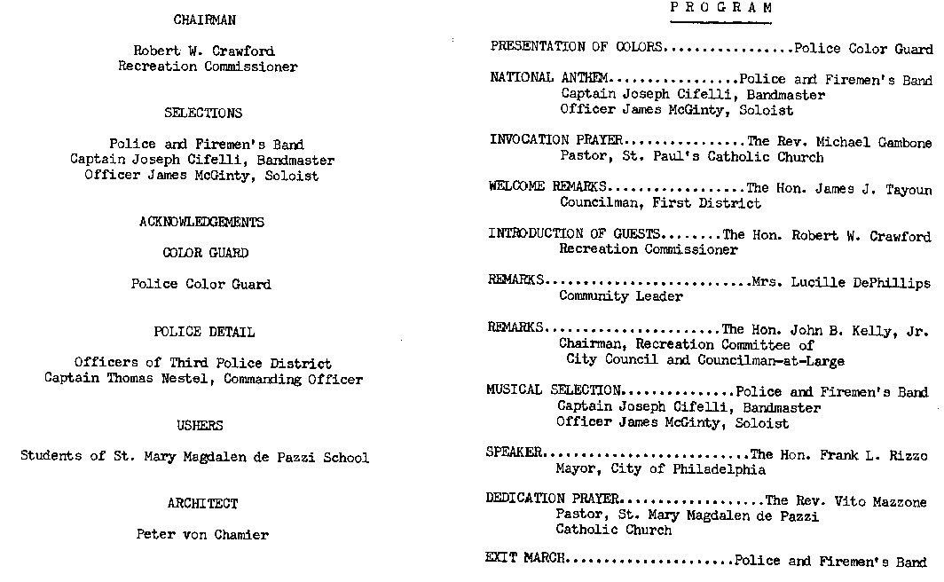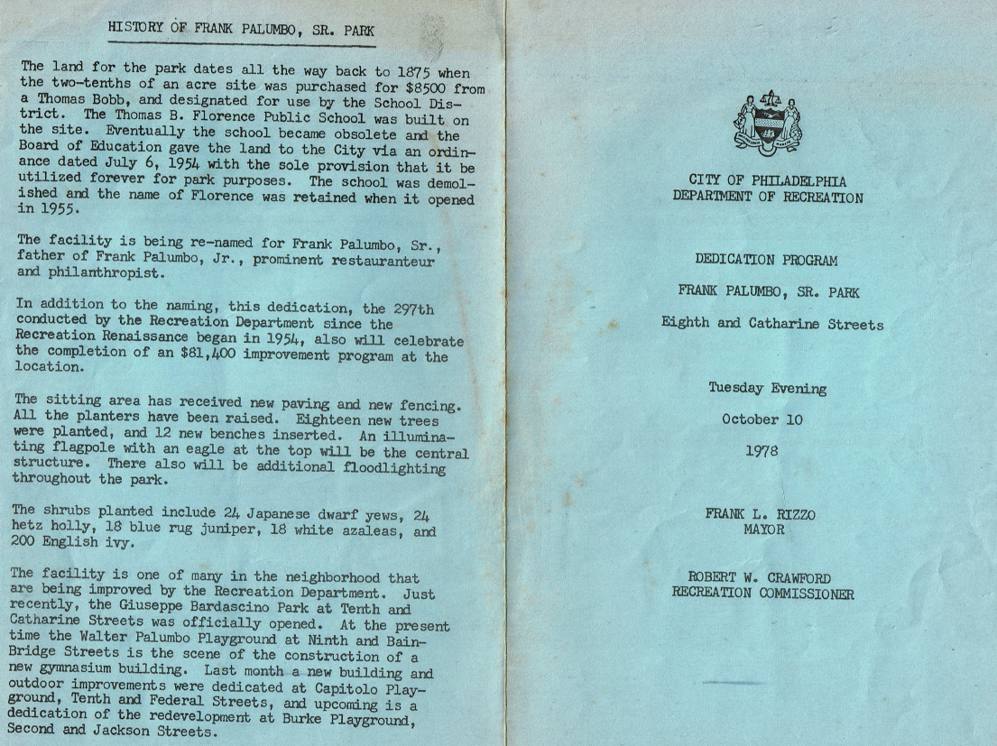 Following its renovations in 1978, it was dedicated in honor of the philanthropist and restaurateur Frank Palumbo Sr., who ran a boarding house and kitchen for Italian immigrant laborers in Bella Vista.